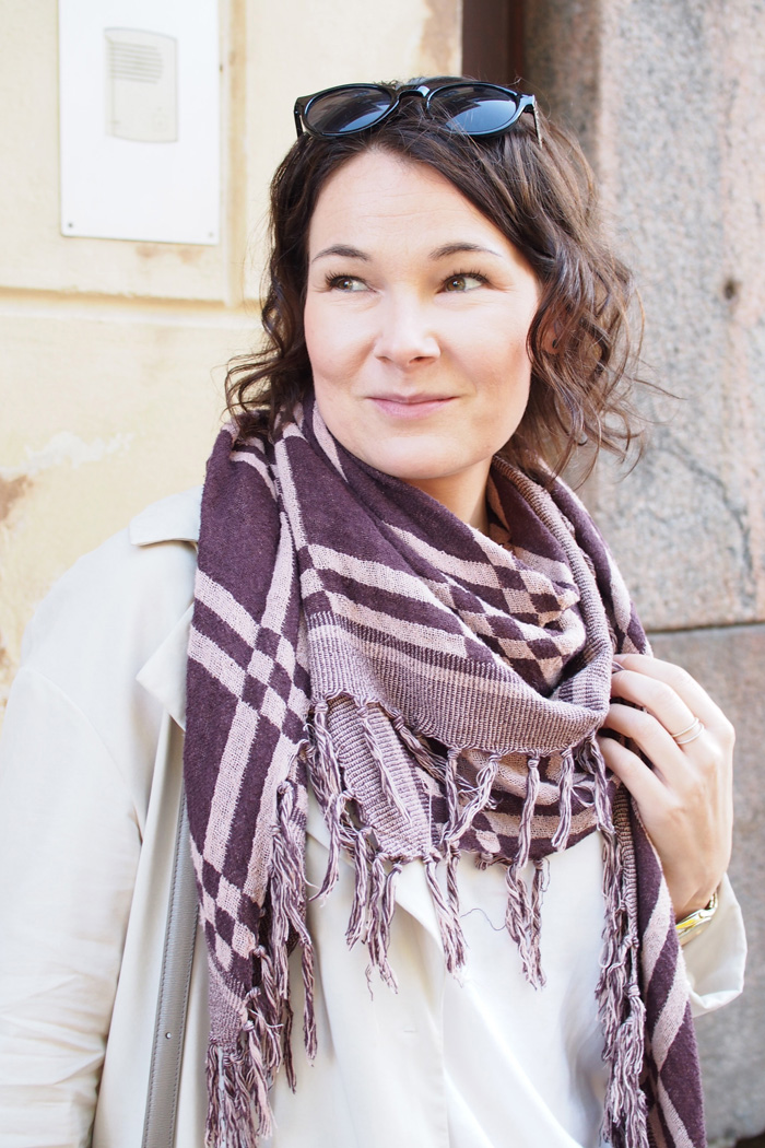takki H&M Conscious*, toppi Falconeri, huivi Becksöndergard*,