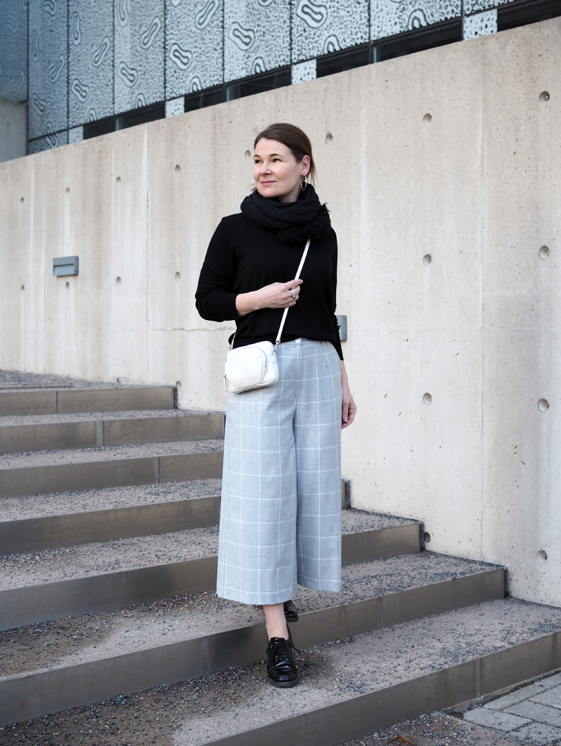 Huomaatte kuvista varmaankin ensimmäisenä uudet housuni, jotka ovat minulta niin suurta revittelyä, etten muista milloin olisin hypännyt näin reilusti oman turvallisuusalueeni ulkopuolelle. Tässä ne kuitenkin ovat, kotimaisen Voglian -50% alerekistä löytyneet harmaat ruutulevarit!