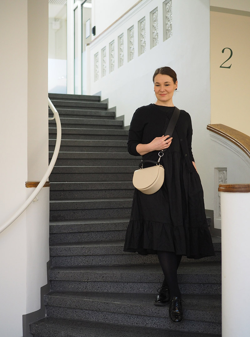 neuletakki Arela, mekko Miia Halmesmaa, laukku Marimekko*, kengät Pomar*, korut Lillan Helsinki*