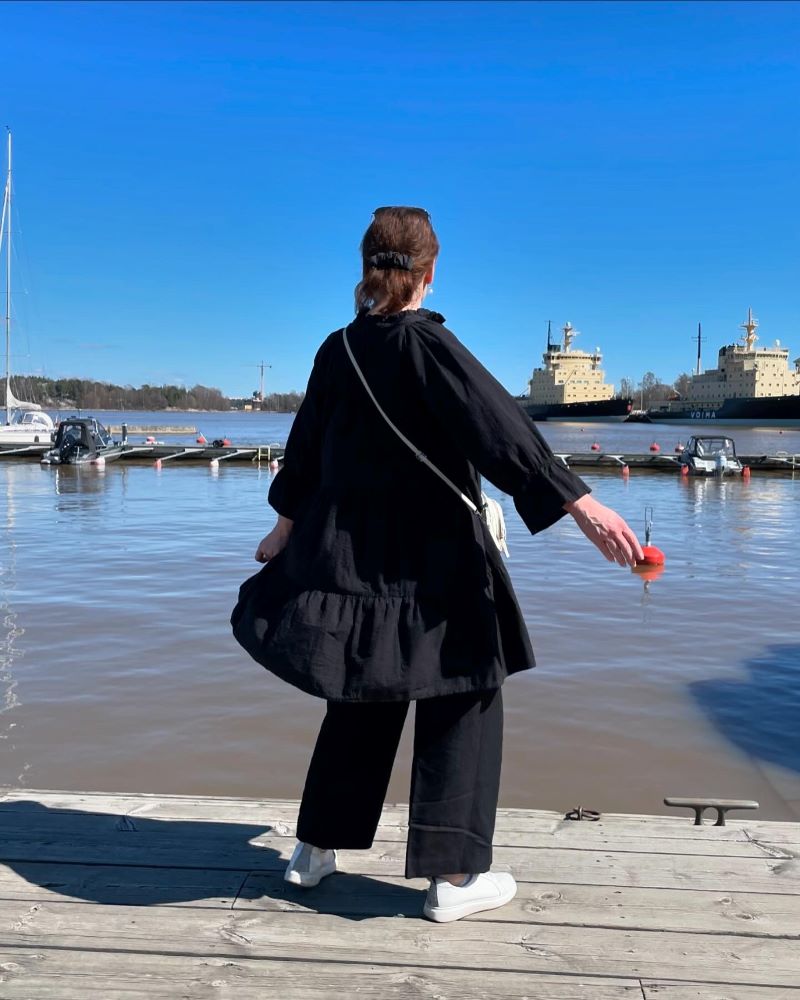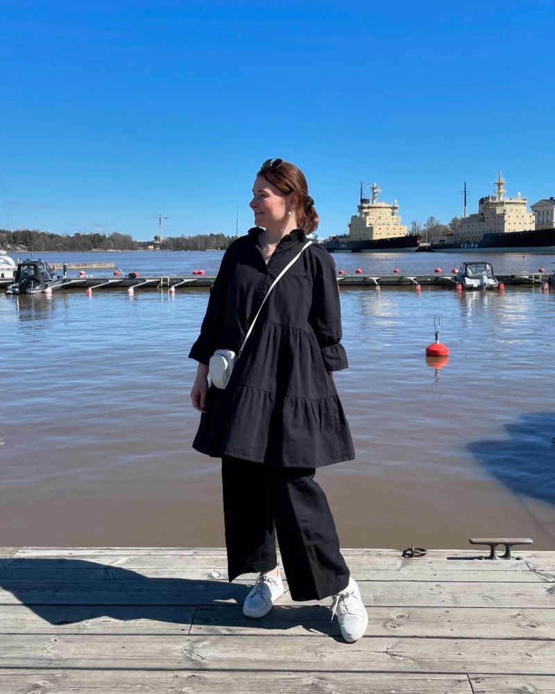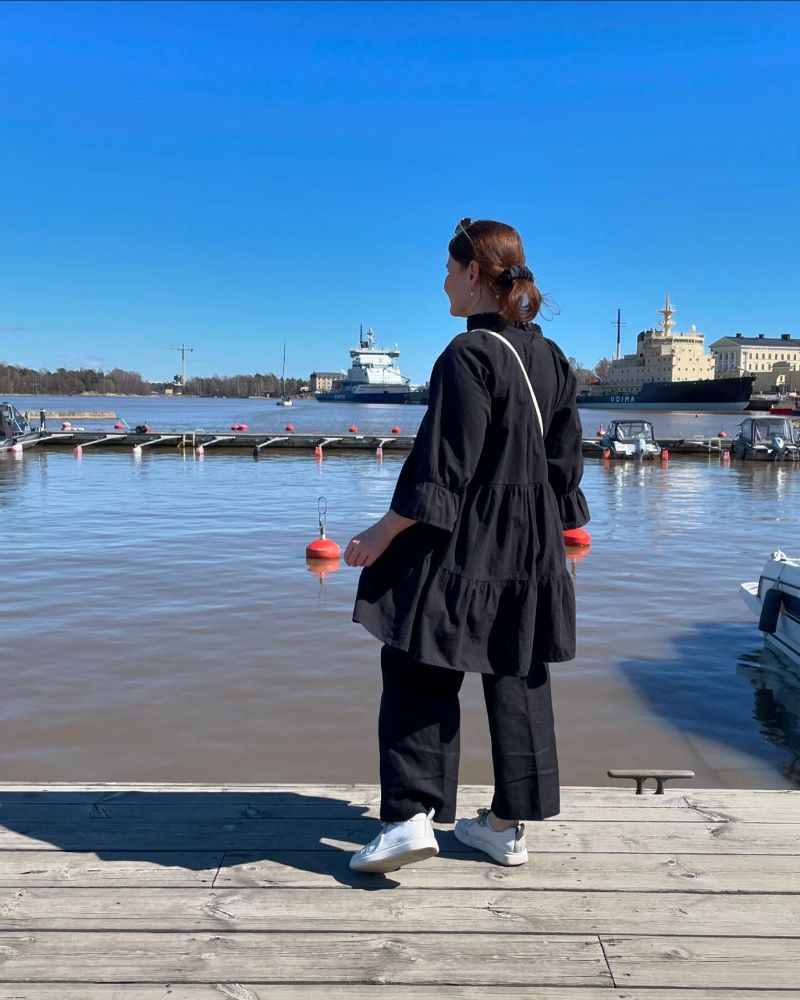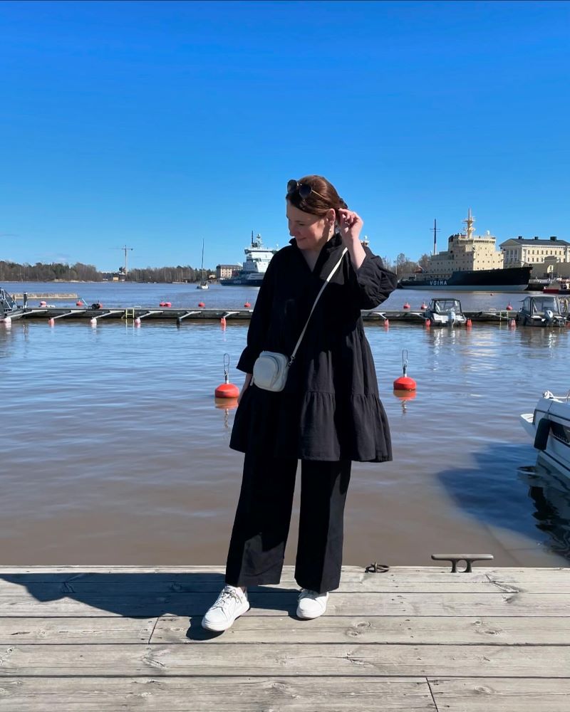 mekko ja hiussolki Gauhar Helsinki, housut Ralph Lauren, laukku Filippa K, korvikset Aida Impact, tennarit Pomar (saatu)