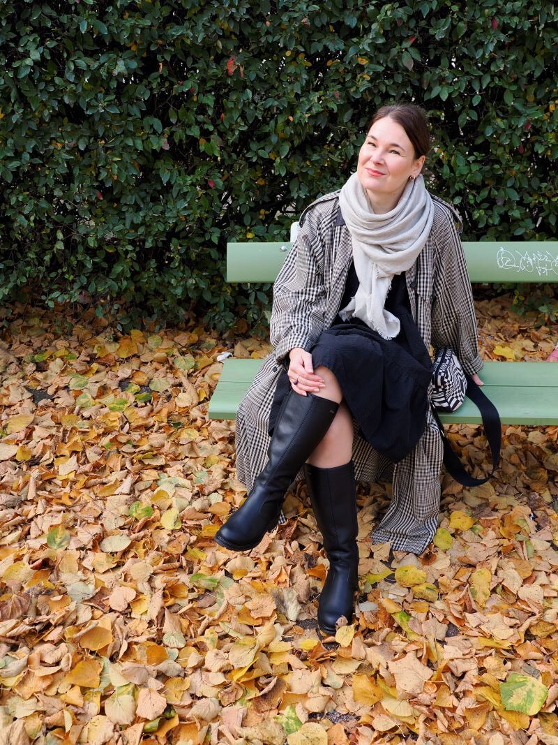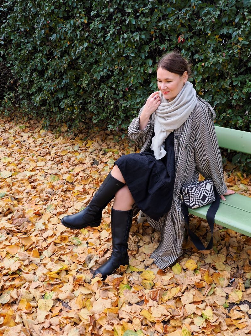 takki kirppikseltä, huivi YourFace (saatu), mekko Gauhar Helsinki, laukku Johanna Gullichsen, saappaat Pomar (saatu)