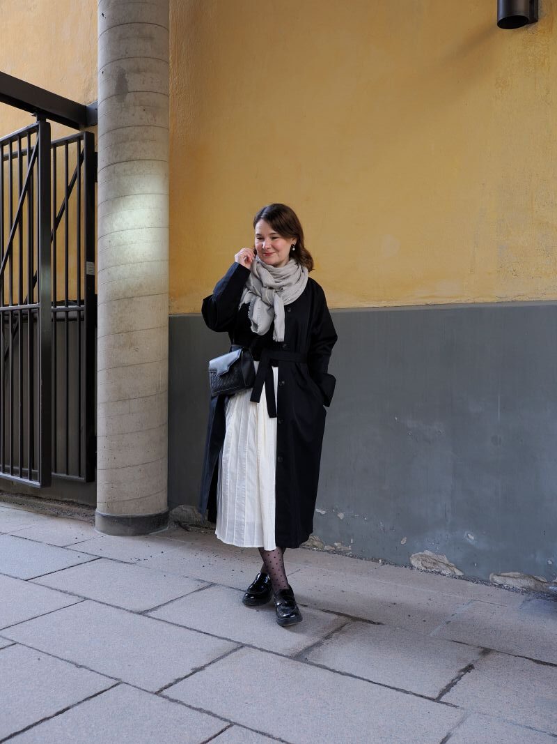 Olen muutenkin menneen talven aikana löytänyt vaaleiden alaosien ilon, joten oli kiva löytää luonnonvalkoisten sammareiden lisäksi myös vaalea hame. Toki yhdistän vaaleaan alaosaan aina mustan yläosan, kaikki muut yhdistelmät tuntuvat lähes kauhistuttavilta, mutta se, että päällä on noin suurena pintana jotain muutakin kuin tummaa, on minulta jo mahtavaa edistystä.