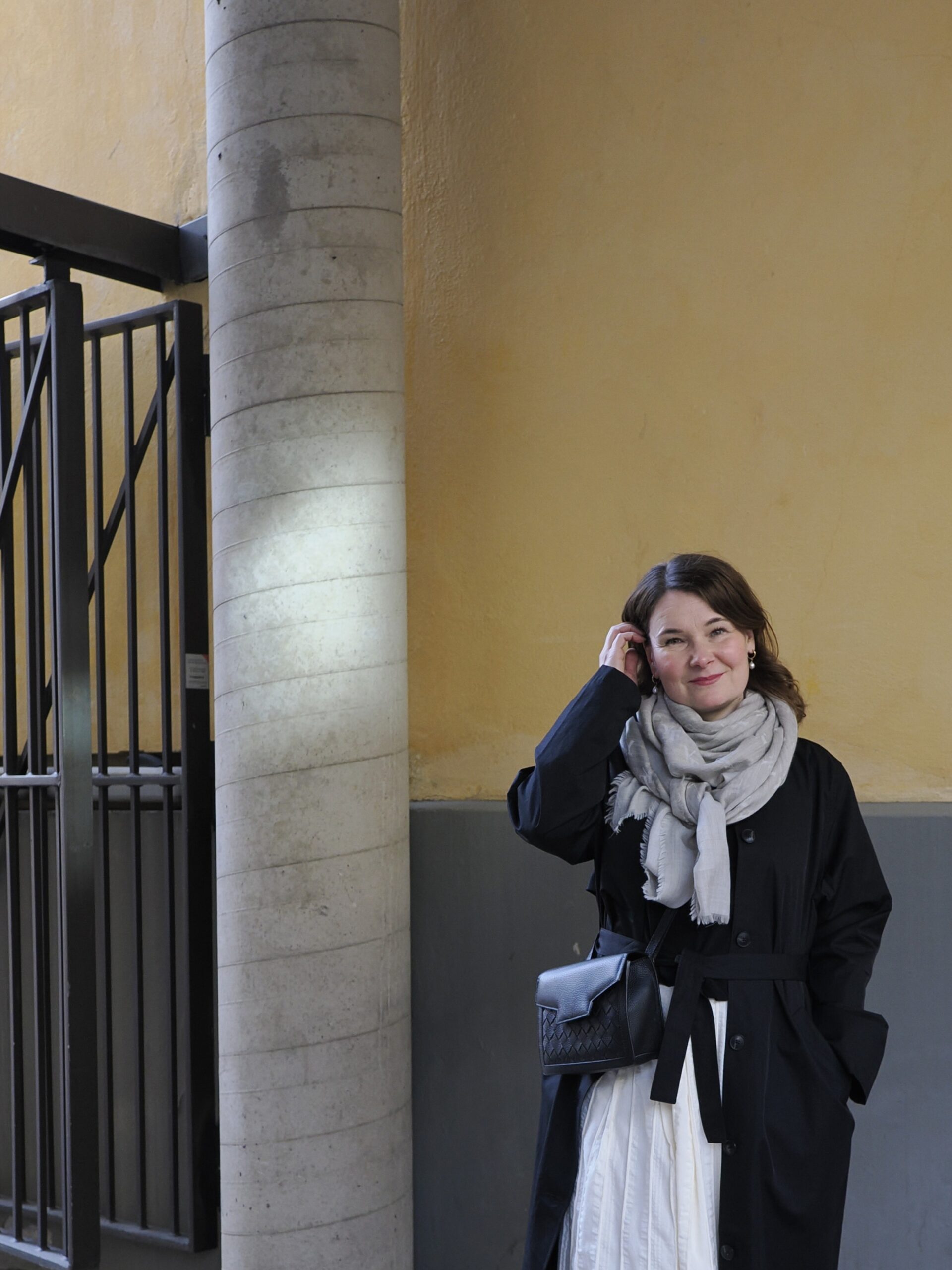 takki R-Collection, huivi YourFace (saatu viime vuonna), hame Samuji, laukku Lovia, kengät Pomar (saatu kolme vuotta sitten)